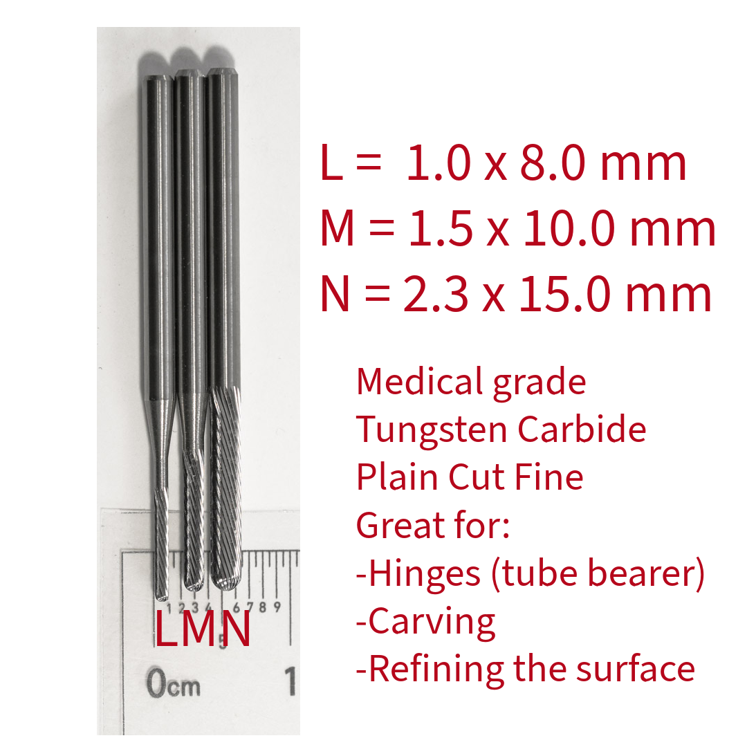1mm round throughout and 8mm cutting surface, Tungsten Carbide Rotary File Fine Cut. Great for getting into the tiniest of corners to “file” off solder and erase dents/scratches. Then use the new sanding sticks to get into those areas to fine finish them.